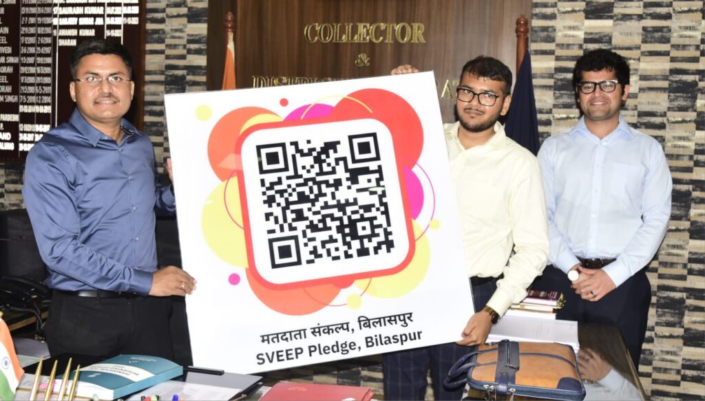 बिलासपुर- कलेक्टर एवं जिला निर्वाचन अधिकारी श्री अवनीश शरण ने स्वीप अभियान के अंतर्गत मतदाता संकल्प के लिए क्यूआर कोड का शुभारंभ किया। स्मार्ट सिटी एवं नगर निगम बिलासपुर द्वारा स्वीप अभियान को गति प्रदान करने के लिए इस क्यूआर कोड का निर्माण किया गया है। कलेक्टर ने इस मौके पर प्रसन्नता व्यक्त करते हुए युवाओं को अधिक से अधिक इसका उपयोग कर मतदान में भागीदारी का आह्वान किया है। मतदाताओं द्वारा संकल्प लेने के उपरांत इसमें एक प्रमाण पत्र भी ऑनलाइन प्राप्त होगा। इस अवसर पर स्मार्ट सिटी के एमडी व नगर निगम आयुक्त अमित कुमार एवं प्रशिक्षु आईएएस अधिकारी एवं सहायक कलेक्टर तन्मय खन्ना भी उपस्थित थे । क्यूआर कोड को जिला कार्यालय के सामने दीवार पर भी आम जनता के लिए प्रदर्शित किया गया है…