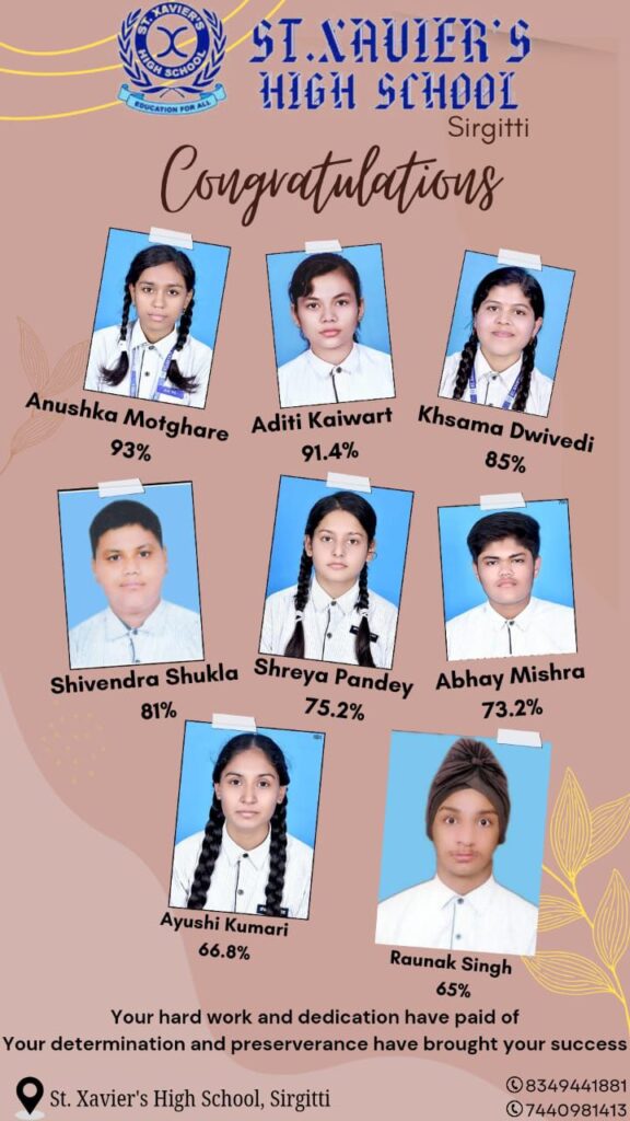 बिलासपुर – सेंट जेवियर्स चैन आफ स्कूल सिरगिट्टी का परीक्षा परिणाम हर वर्ष की तरह इस वर्ष भी अच्छा रहा दसवीं कक्षा हर वर्ष की तरह इस वर्ष भी छात्र की अपेक्षा छात्रों ने बाजी मारते हुए अपने माता पिता व विद्यालय का नाम रोशन किया है संस्था के प्रचार्य संतोषी डाकवा व शिक्षको ने सभी छात्र छात्राओं को बधाई देते हुए आगे कड़ी मेहनत से अपने मुकाम पर पहुंचने उज्ज्वल भविष्य की कामना किए है।