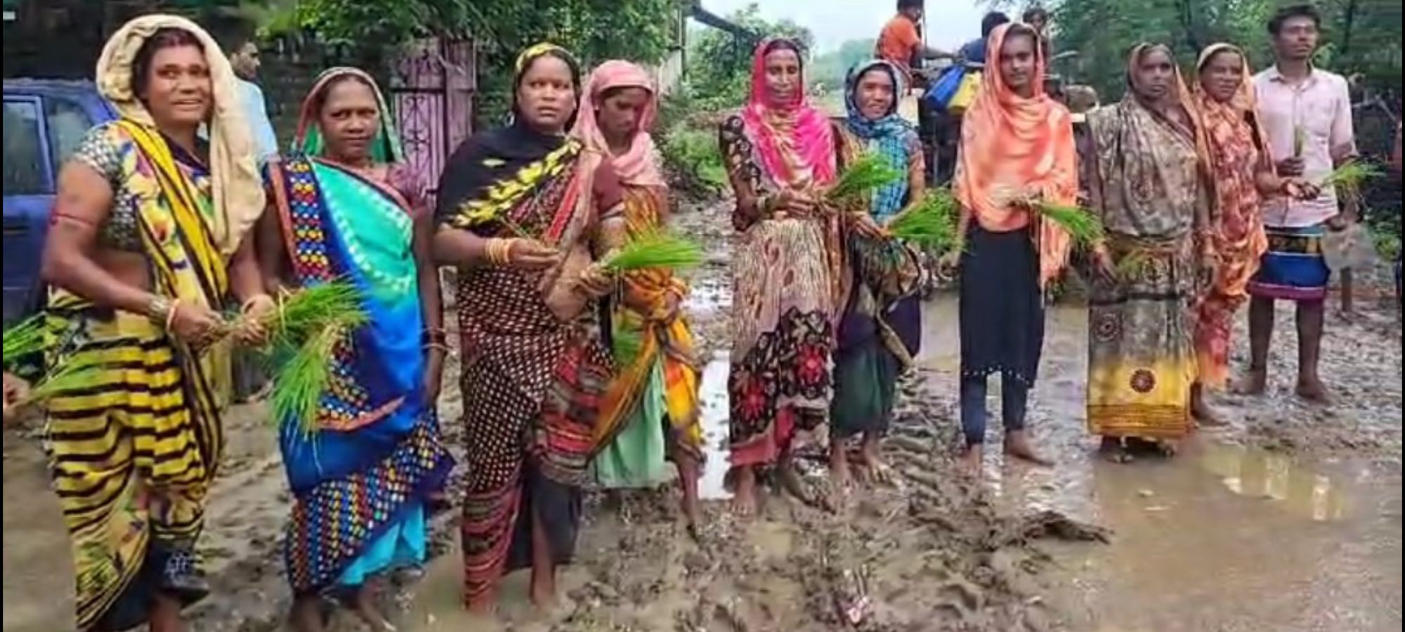 – खेतों की तरह हल चलाकर सड़क पर ग्रामीणों ने रोपा धान।