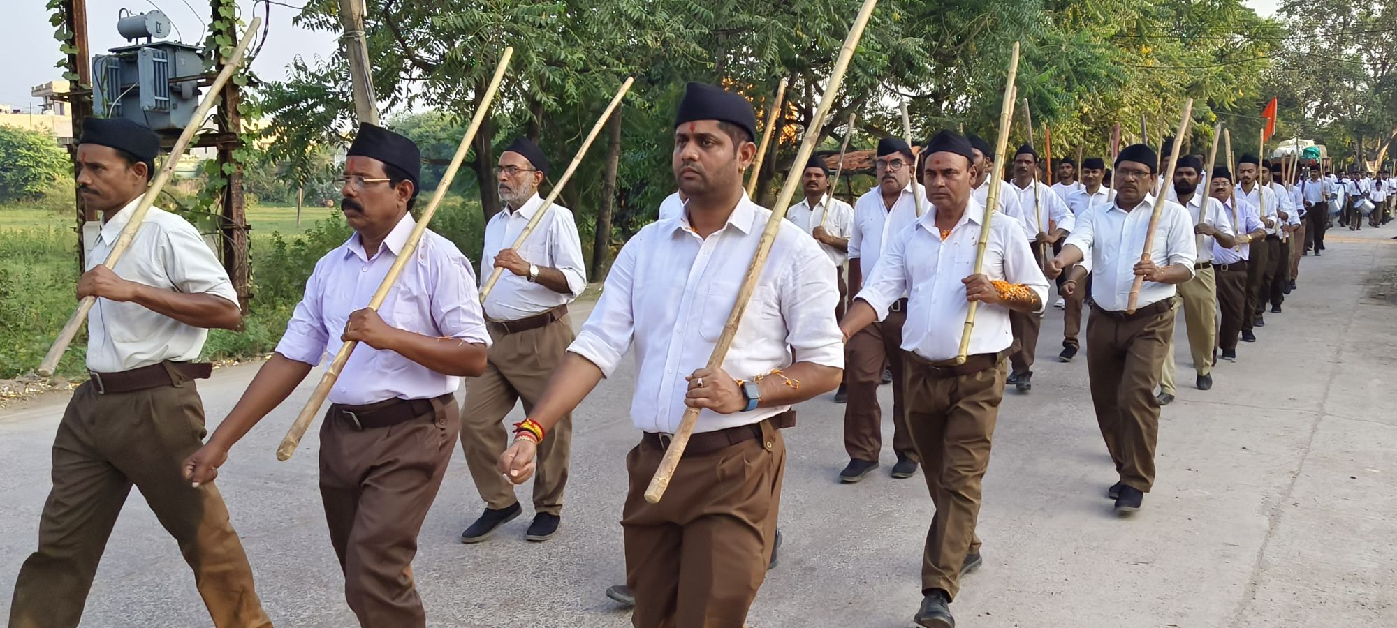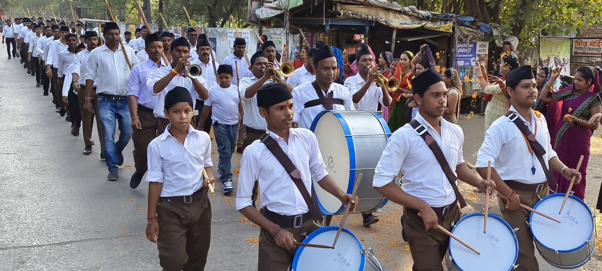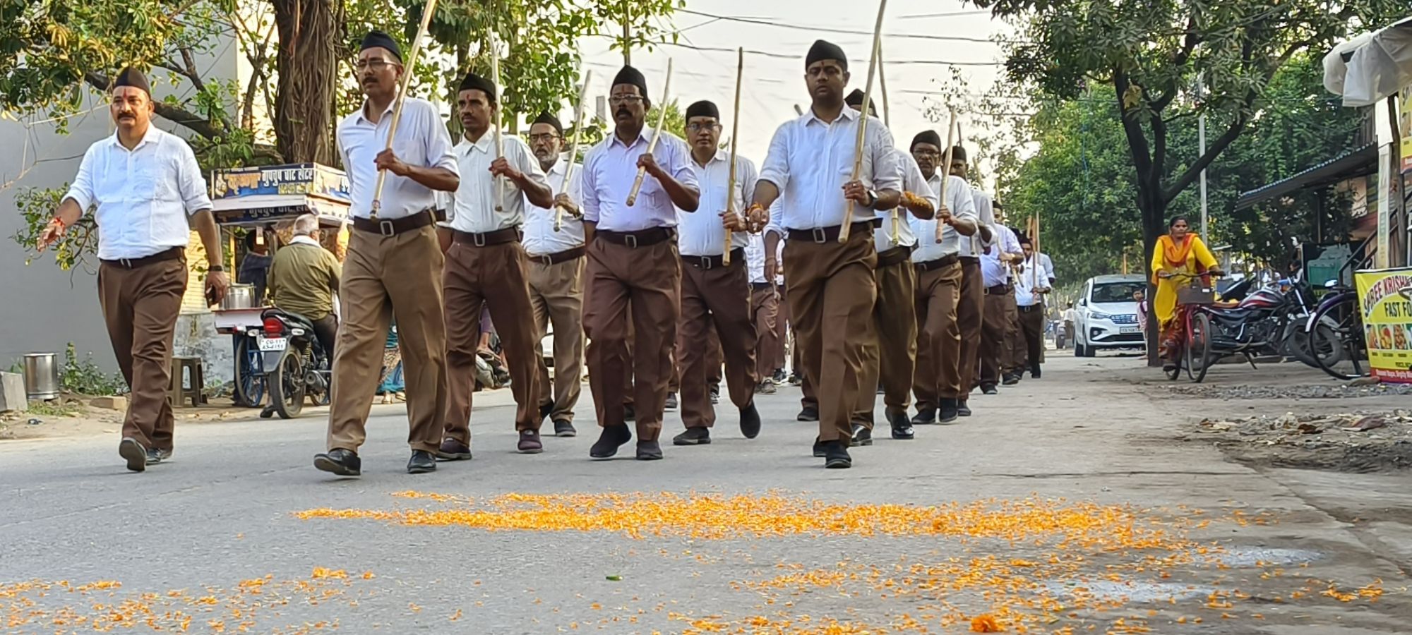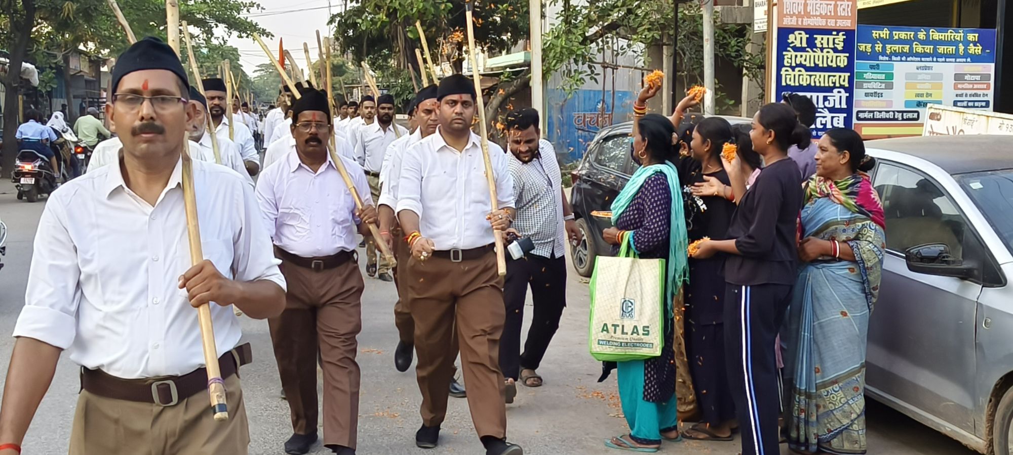 जिसके बाद एक साथ माता भारती के जयकारे लगाते हुए पथ संचलन में अनुशासन और समयबद्धता देखी गई काफी संख्या में स्वयं सेवक अपनी वेशभूषा में धारण व हाथों मे दंड लिए कदम से कदम मिलाकर चलते रहे। इस दौरान भगवा ध्वज हाथों मे लिए करतल ताल भी आगे आगे चलती रही संघ के पथ संचलन को देखने के लिए सडक़ों पर बड़ी संख्या में लोग मौजूद रहे