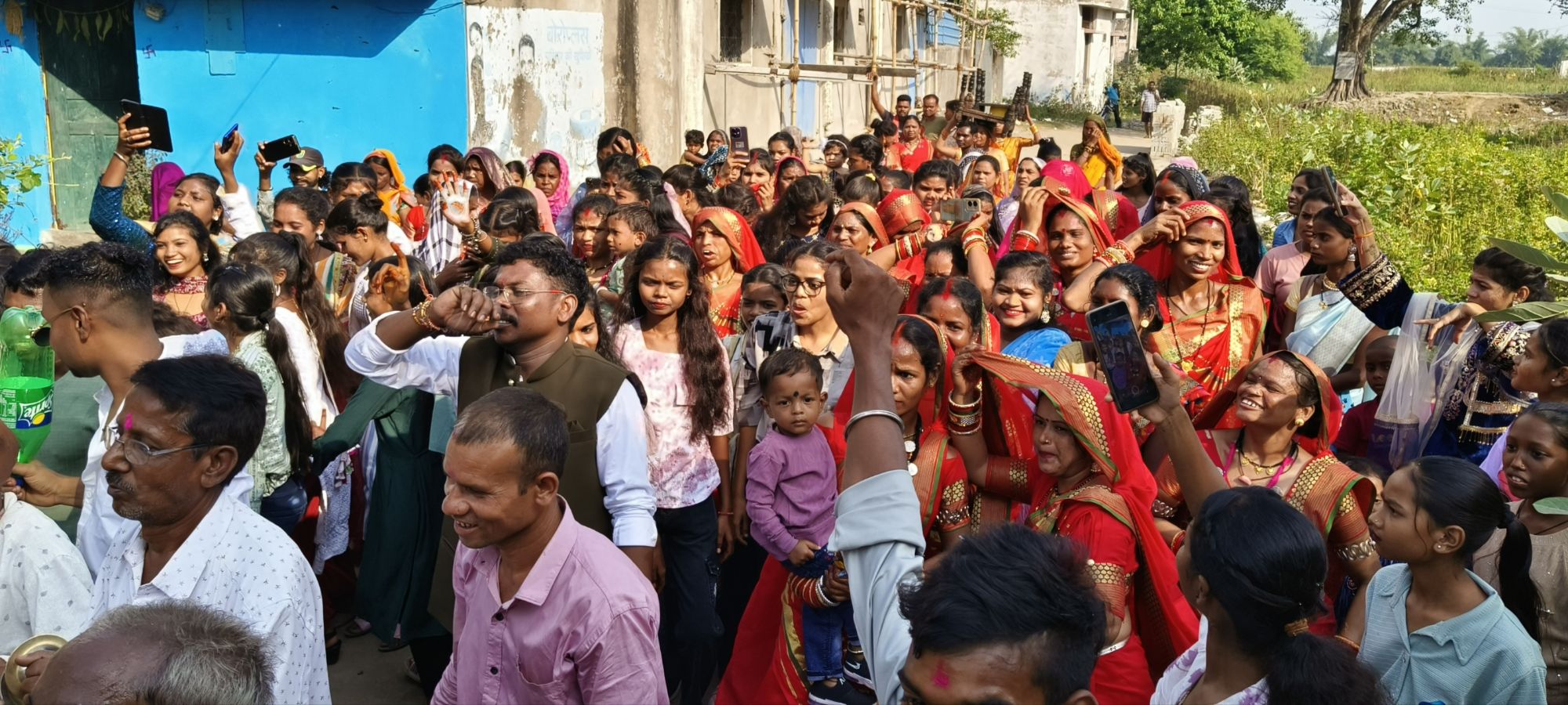 – लाल परिधान मे गौरा-गौरी गीत गाते है समुदाय के प्रमुख महिलाए।