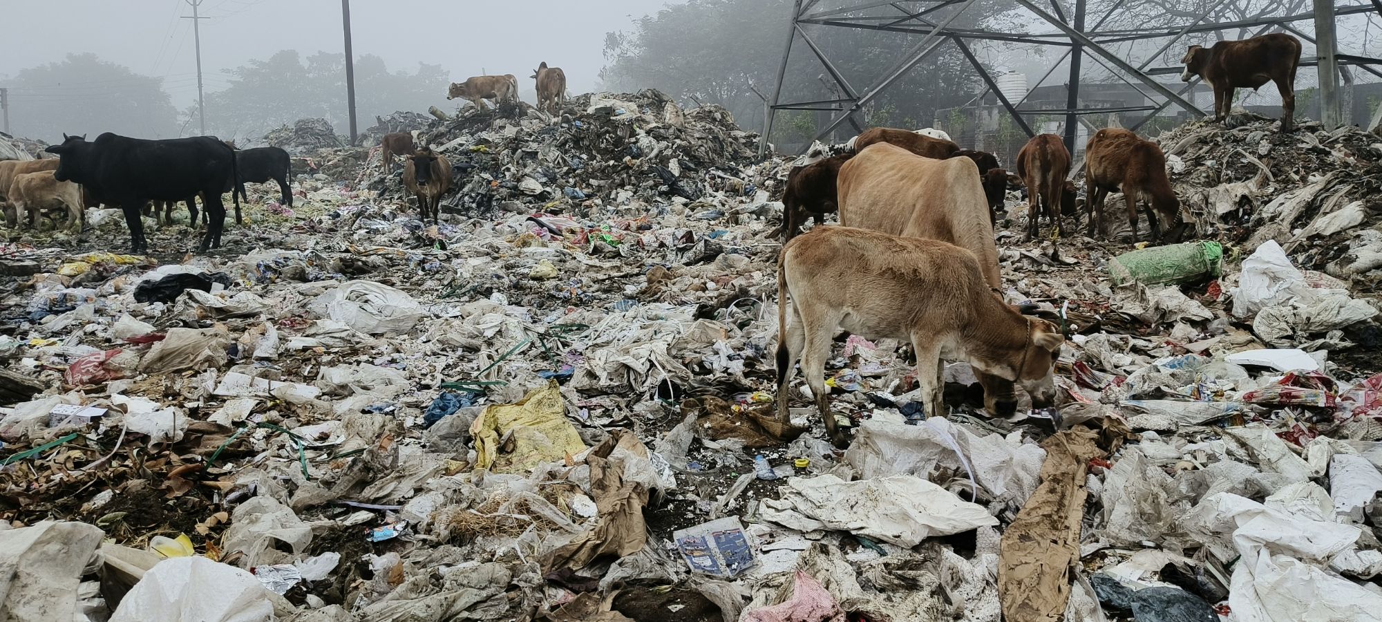 (दुर्गध के बीच निवाला तलाश रहें मवेशी)