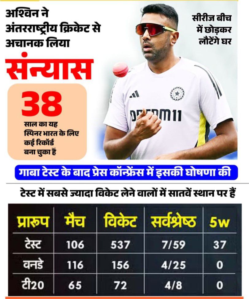 दरअसल गाबा टेस्ट मैच ड्रॉ होने के बाद आर अश्विन ने प्रेस कॉन्फ्रेंस में कहा कि अंतरराष्ट्रीय क्रिकेटर के तौर पर आज मेरा आखिरी दिन था। अंतरराष्ट्रीय क्रिकेट के तौर पर मैं अब गेम से नहीं जुड़ा रहूंगा, लेकिन किसी ना किसी तरह खेल से जरूर जुड़ा रहूंगा। अश्विन ने एक्स पोस्ट पर भी संन्यास का एलान करते हुए लिखा कि बहुत सोचने के बाद, मैंने टेस्ट क्रिकेट से संन्यास का एलान का फैसला किया है। भारत का प्रतिनिधित्व करते हुए यह एक अविश्वसनीय जर्नी रही, जो अविस्मरणीय पलों से भरी हुई है। मेरे साथियों, कोचों, बीसीसीआई और सबसे अहम दर्शकों को उनके अटूट समर्थन के लिए धन्यवाद। आगे नई चुनौतियों का इंतजार है, लेकिन टेस्ट क्रिकेट हमेशा मेरे दिल में एक खास जगह रखेगा।