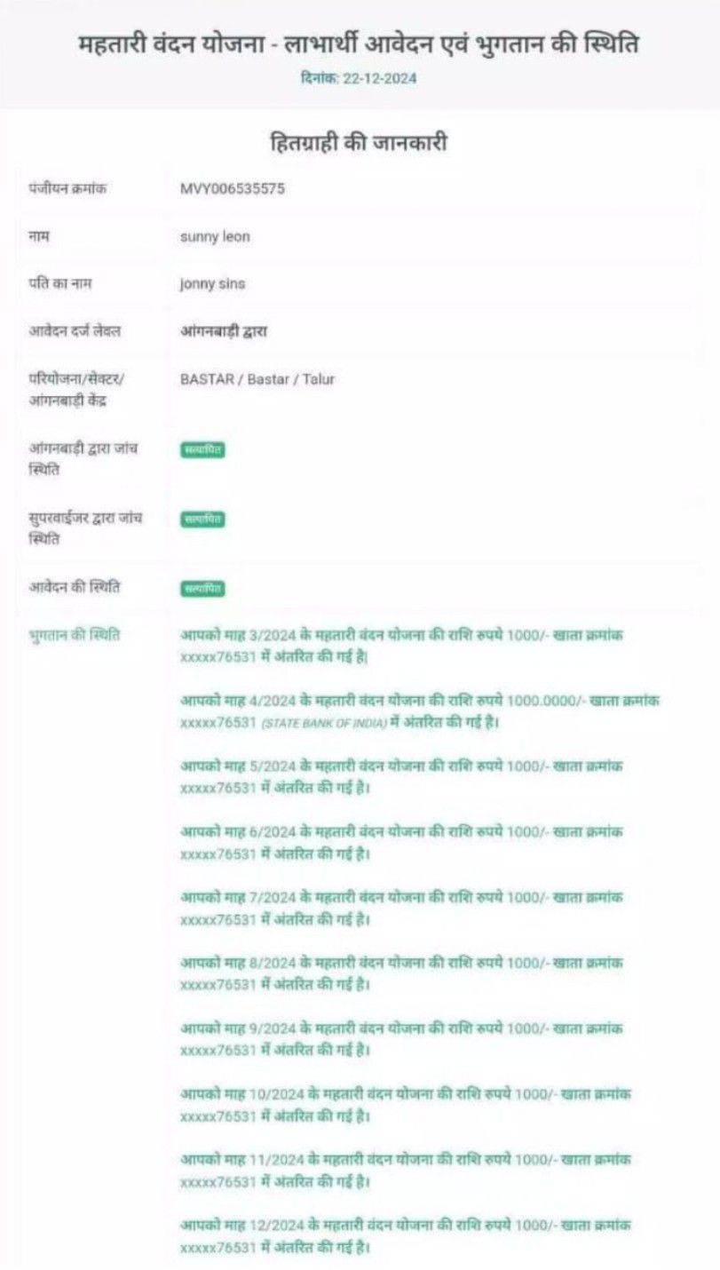 जिला कार्यक्रम अधिकारी ने बताया कि मीडिया में दिखाई जा रहे हैं समाचार महतारी वंदन योजना में सनी लियोन को मिल रहे हजार रुपए के समाचार के शिकायत प्राप्त हुई, जिसकी प्रारंभिक जांच से पता चला की उक्त आवेदन ग्राम तालूर की आंगनवाड़ी कार्यकर्ता वेदमाती जोशी के आईडी से रजिस्टर्ड हुआ है गहराई से जांच किए जाने पर पता चला की वीरेंद्र जोशी नामक व्यक्ति द्वारा इस संबंध में जो जालसाजी कर अवैधानिक तरीके से राशि का आहरण अपने खाते में किया जा रहा है।