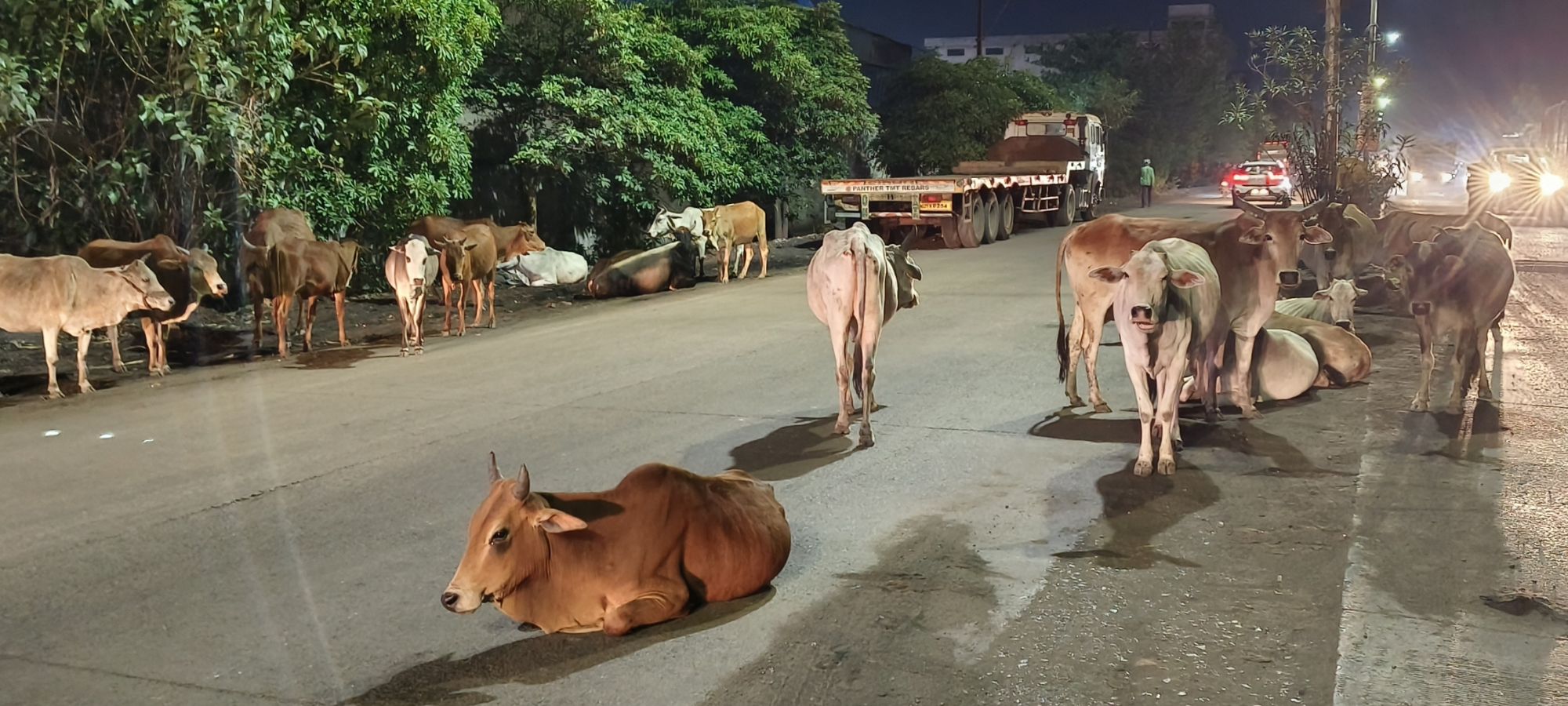 (मुख्य सड़क कई जगह से जर्जर,रात्रि मे मवेशियों का जमघट)