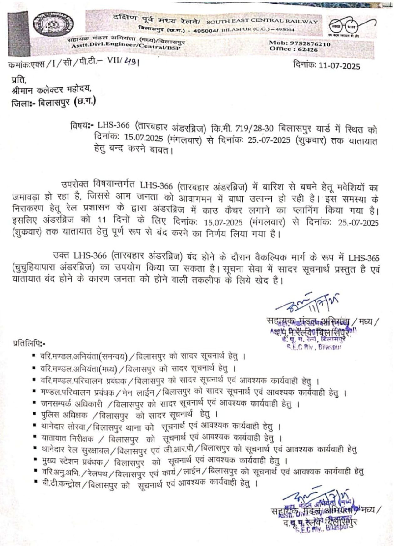 बिलासपुर – बिलासपुर रेलवे द्वारा एक बार फिर क्षेत्र की जानता परेशान करने की तैयारी मे है रेलवे की लापरवाही का नतीजा आमजन को भुगतना पड़ेगा। दरअसल इस बार रेलवे द्वारा सिरगिट्टी तारबाहर अंडर ब्रिज को पुरे 11 दिनों के लिए बंद करने का फरमान जारी किया गया है। जिस फरमान के बाद इस ब्रिज से आवागमन करने वाले लोगों के माथे पर चिंता की लकीर दिखने लगी है अंडर ब्रिज पर काउ कैचर लगाने 15 जुलाई से 25 जुलाई तक पूरे 11 दिनो के लिए ब्रिज से आवागमन बंद करने का फैसला लिया गया है। रेलवे की माने तो अंडरब्रिज में मवेशियों के जमावड़े और जाम की स्थिति को देखते हुए रेलवे द्वारा ब्रिज के दोनों ओर काउ कैचर लगाने का काम किया जाएगा। रेलवे द्वारा यह फैसला आमजन की परेशानियों को अनदेखा करते हुए लिया गया है जों एक बार फिर इस अंडर ब्रिज से आवागमन करने वाले लोगों के लिए बहुत बड़ी मुसीबत खड़ी पैदा कर देगी। दरअसल यह शहर का सबसे व्यस्ततम अंडरब्रिज है जहाँ से रोजाना हजारों लोग गुजरते हैं रेलवे ने इस दौरान वैकल्पिक व्यवस्था के लिए चुचुहिया पारा स्थित अंडर व ओव्हर ब्रिज को बताया है जिसके चलते न केवल इस क्षेत्र मे यातायात का दबाव बढ़ेगा बल्कि अधिक दुरी तय कर लोग एक बार फिर परेशानी से जुझते नजर आएँगे।
