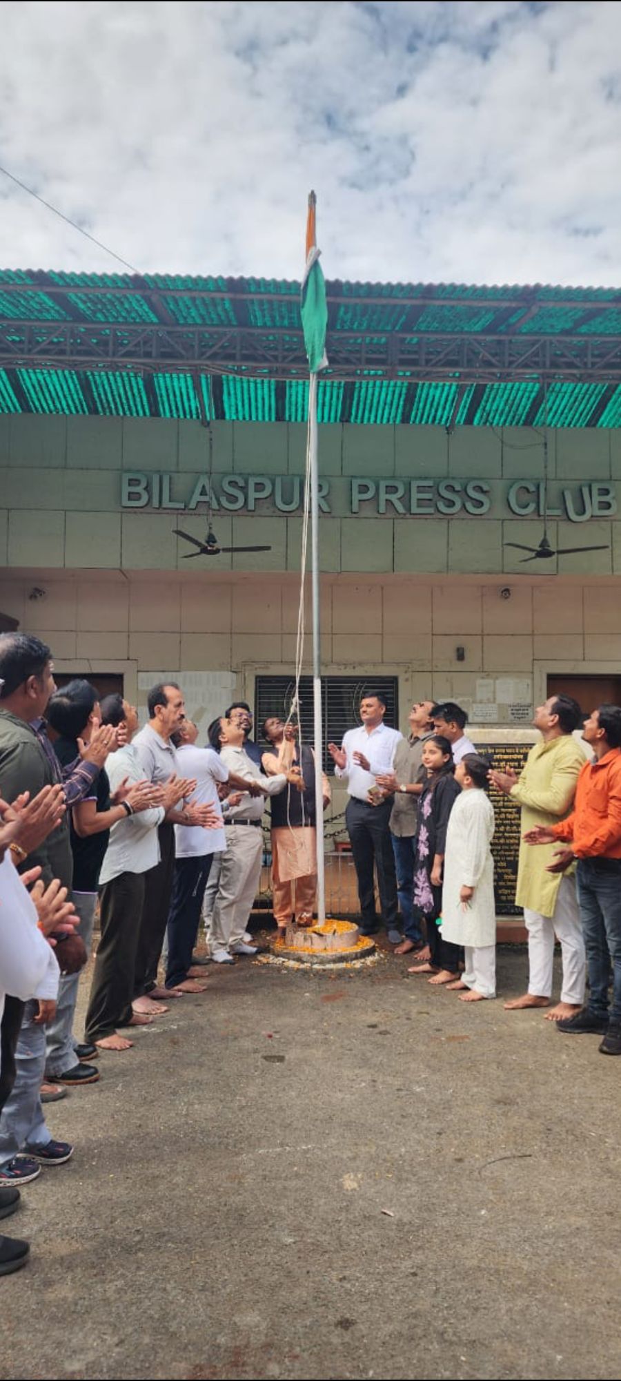 बिलासपुर। शुक्रवार को देश की आजादी का जश्न हर तरफ मनाया गया। सुबह से ही जगह-जगह ध्वजारोहण का कार्यक्रम किया जाने लगा। राघवेन्द्र राव सभा भवन स्थित बिलासपुर प्रेस क्लब में भी सुबह 8:00 बजे ध्वजा रोहन किया गया। प्रेस क्लब अध्यक्ष इरशाद अली ने यहां ध्वज फहराकर झंडे को सलामी दी। इस मौके पर सभी पत्रकारों ने राष्ट्रगान किया और भारत माता के जयकारे लगाए।