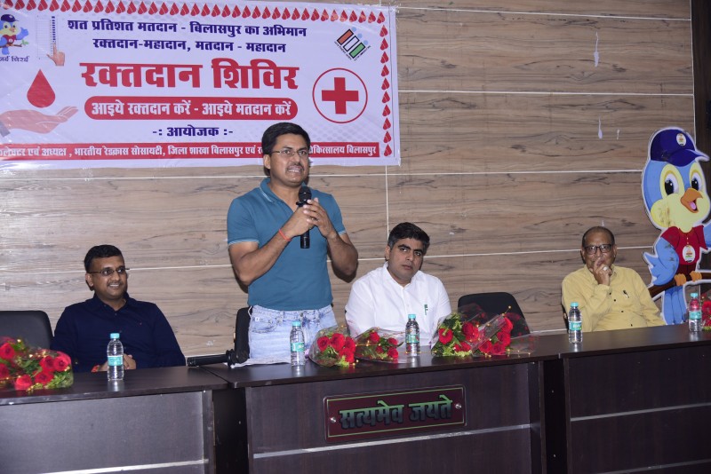शिविर में मौजूद लोगों को कलेक्टर ने संबोधित करते हुए कहा कि रक्तदान पुण्य का कार्य है। रक्तदान के जरिए एक व्यक्ति दूसरे को नई जिंदगी देता है। उन्होंने इसके लिए सभी को बधाई देते हुए 17 नवंबर को लोकतंत्र के सबसे बड़े उत्सव में इसी प्रकार बढ़-चढ़ कर भाग लेने की अपील की। कलेक्टर ने कहा कि जिले में शत प्रतिशत मतदान का लक्ष्य हासिल कर हमें बिलासपुर का अभिमान बढ़ाना है। लोकतंत्र की मजबूती के लिए हर व्यक्ति को अनिवार्य रूप से मतदान करना होगा। यह हमारा कर्तव्य ही नहीं हमारा अधिकार है। पांच वर्षो में यह अवसर हमें मिलता है। कलेक्टर ने पहली दफा वोट करने जा रहे नवमतदाताओं को भी सम्मनित किया। इसके अलावा शिविर में रक्तदान करने वाले लोगों को प्रशस्ति पत्र देकर उन्हें भी सम्मानित किया। समाचार लिखे जाने तक शिविर में लगभग 70 यूनिट ब्लड डोनेशन हो गया था। कार्यक्रम मे सीएमएचओ डॉ राजेश शुक्ला, संयुक्त संचालक पशु चिकित्सा श्री तनवर, रेडक्रॉस सोयायटी के जिला समन्यक श्री सौरभ सक्सेना, जिला पंचायत के परियोजना अधिकारी श्री ओम पांडे, विभिन्न विभागों के अधिकारी और बड़ी संख्या में कॉलेज के बच्चे और रक्तदान दाता मौजूद थे।