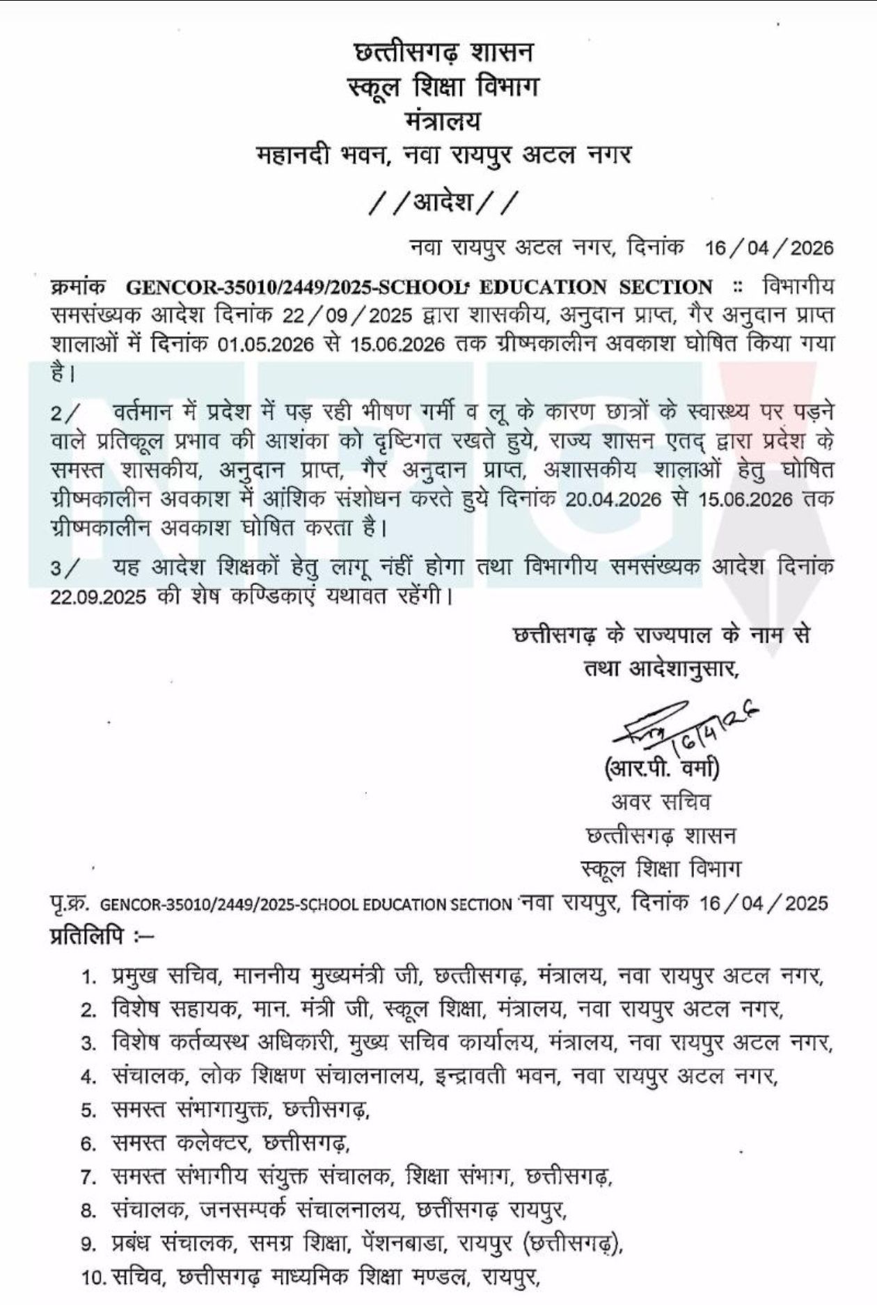बिलासपुर गर्मी के कारण सरकार ने सभी स्कूलों को बंद रखने का फैसला लिया है प्रदेश के सभी स्कूल 20 अप्रैल से 15 जून तक बंद रहेंगे KANHAIYA KAUSHIK/ EDITOR & CHIF 16 April 2026 1 min read छत्तीसगढ़ – भीषण गर्मी व लू के प्रकोप को देखते हुए सरकार ने 20 से 15 जून तक स्कूल बंद रखने जारी किया आदेश KANHAIYA KAUSHIK/ EDITOR & CHIF Continue Reading Previous: पावर प्लांट में बॉयलर फटा,3 की मौत6 गंभीर,मलबे में कुछ के दबे होने की आशंका Leave a Reply Cancel replyYour email address will not be published. Required fields are marked *Comment * Name * Email * Website Save my name, email, and website in this browser for the next time I comment. Related Stories पावर प्लांट में बॉयलर फटा,3 की मौत6 गंभीर,मलबे में कुछ के दबे होने की आशंका 1 min read बिलासपुर पावर प्लांट में बॉयलर फटा,3 की मौत6 गंभीर,मलबे में कुछ के दबे होने की आशंका 14 April 2026 छत्तीसगढ़ में RTE को लेकर टकराव तेज निजी स्कूलों का बड़ा फैसला-इस साल नहीं देंगे एडमिशन 1 min read बिलासपुर छत्तीसगढ़ में RTE को लेकर टकराव तेज निजी स्कूलों का बड़ा फैसला-इस साल नहीं देंगे एडमिशन 4 April 2026 राज्यपाल का आगमन और यहां ख़ूनी संघर्ष,तलवार से वार आँखे निकाली एक की मौत 7 गंभीर 1 min read छत्तीसगढ़ बिलासपुर राज्यपाल का आगमन और यहां ख़ूनी संघर्ष,तलवार से वार आँखे निकाली एक की मौत 7 गंभीर 2 April 2026