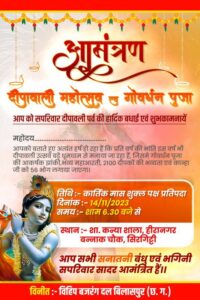 {गोवर्धन पूजा आज सिरगिट्टी मे होगा 2100 दिए से कृष्ण पूजन जगमगाएगा परिसर} सिरगिट्टी स्थित बन्नाक चौक मे मंगलवार को गोवर्धन पूजा के अवसर पर विहिप बजरंग दल सहित सनातियों के द्वारा शाम 6.30 बजे श्री कृष्ण जी की मंगलमय आरती के साथ ही 2100 दिए जलाकर कान्हा जी को 56 भोग के साथ ही दिपावली पर्व मनाया जाएगा।