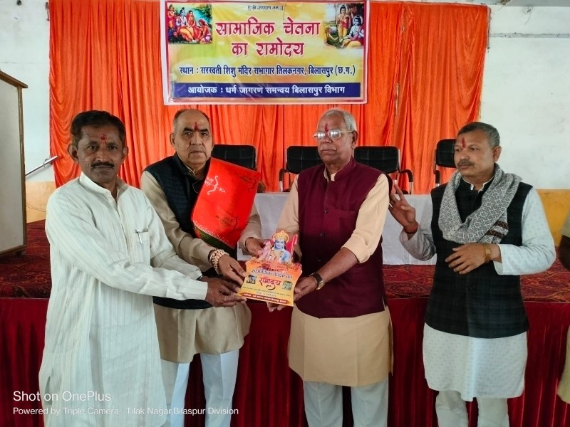 बिलासपुर – प्रभु श्रीराम जी के जीवन मे विभिन्न समाज का योगदान व उनके आदर्शो का अंगीकार करने का एक छोटा सा प्रयास सामाजिक चेतना का रामोदय कार्यक्रम रविवार को सरस्वती शिशु मंदिर बिलासपुर मे सम्पन्न कराया गया। कार्यक्रम मे मुख्य अतिथि के रूप मे राष्ट्रीय स्वयंसेवक संघ के छत्तीसगढ प्रांत प्रचारक प्रेम शंकर सिदार विशिष्ट अतिथि धर्म जागरण समन्वय के क्षेत्र प्रमुख रेवा राम धर्म जागरण समन्वय के प्रांत सहसंयोजक अभय सिंह व मुख्य वक्ता के रूप मे विद्याभारती के प्रांतीय अध्यक्ष जुडावन सिंह रहे कार्यक्रम की भूमिका व मंच संचालन विभाग संयोजक भृगु अवस्थी ने किया इस अवसर पर मुख्य अतिथि प्रेम शंकर ने अपने उद्बोधन मे कहा कि आज अयोध्या मे सिर्फ मंदिर निर्माण ही नही बल्कि राष्ट्र निर्माण हो रहा है। सभी राष्ट्र अपने आदर्शो के प्रति सजग रहे हम सभी सौभाग्यशाली है जो इस अमृत काल के साक्षी बनने जा रहे । राम जन जन के हृदय मे निवास करते है इसे हम गांवो की रामायण मंडली मे देखते है यही तो हमारे धर्म की आस्था है इसलिए धर्म भारत की आत्मा है।