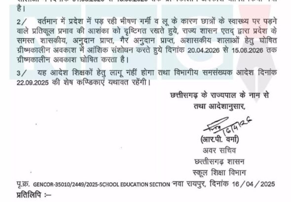 छत्तीसगढ़ – भीषण गर्मी व लू के प्रकोप को देखते हुए सरकार ने 20 से 15 जून...